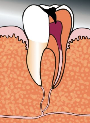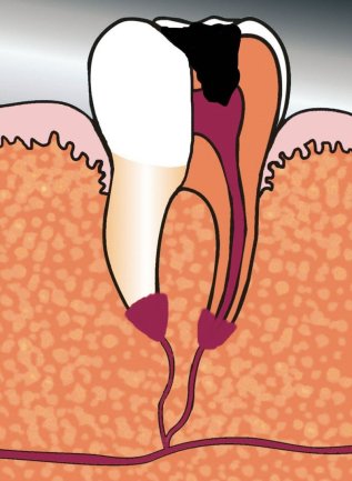 Das Zahnmark kann auch langsam absterben (Nekrose). Diese Entwicklung erfolgt schleichend und ist meist nicht mit Schmerzen verbunden. Auch hier kommt es später zur Auflösung des Knochens um die Wurzelspitze.