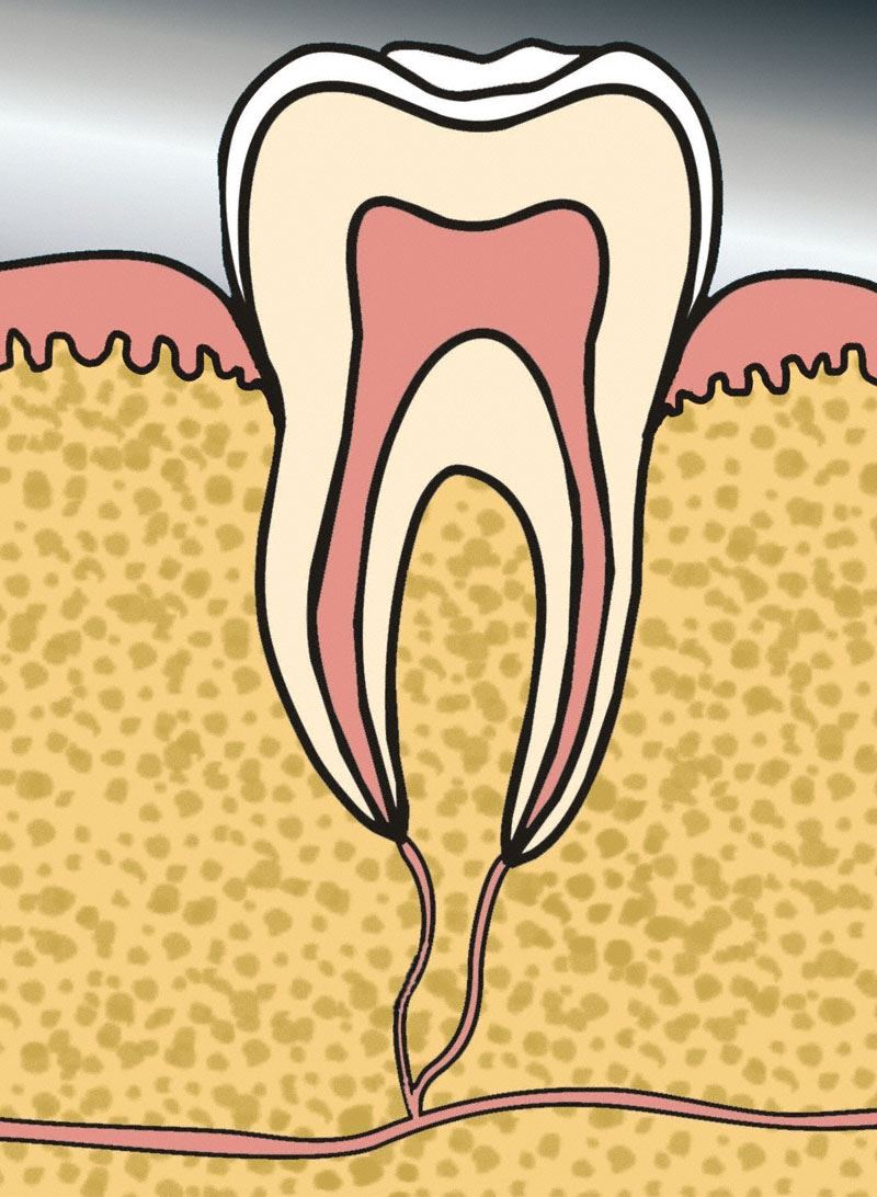 Der gesunde Zahn besteht aus einer äußeren Schmelzschicht. Der innere Bereich des Zahnes gliedert sich in die Bereiche Dentin und Pulpa auf. Das Dentin liegt unter dem Schmelz. Im Innersten befindet sich das Gefäß-Nervenbündel, die Pulpa. Der gesunde Zahn sollte von einem gesunden Parodont umgeben sein.