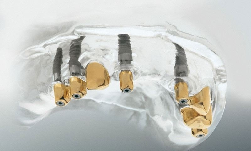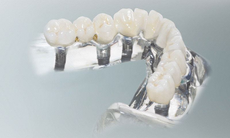 Der Zahnersatz wird vom Zahntechniker im Zahnlabor erstellt. Da jetzt der Implantat-Körper fest im Kieferknochen verankert ist, kann der endgültige Zahnersatz (Krone, Brücke oder Prothese) mit dem Implantatkörper verbunden werden. Der implantatgetragene Zahnersatz hält sicher und fest.