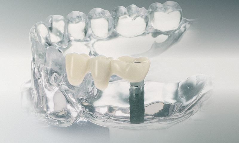 Fehlt ein Zahn zur hinteren Begrenzung einer Lücke, übernimmt ein Implantat die Aufgabe eines Pfeilerzahnes zur Brückenversorgung. Die Kombination Krone/Implantat ermöglicht hier eine Brücke.