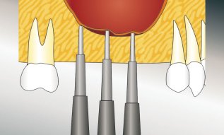 Mit einem dünnen Pilotbohrer wird dann die Position des Implantats festgelegt. Mit verschiedenen Fräsen wird die Knochenbohrung präpariert, die exakt auf die Größe des Implantats abgestimmt sein muss.